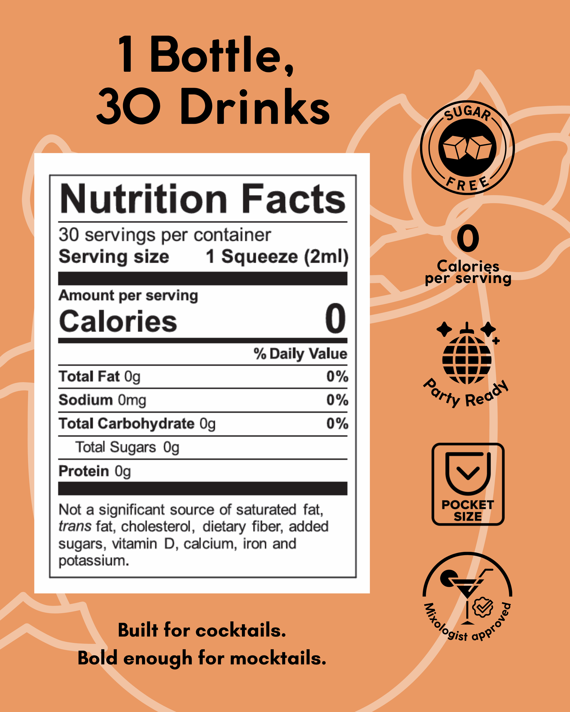 Each 60 ml bottle makes ~30 drinks at 2 ml per serve. Pocket-size bottle, party-size output.